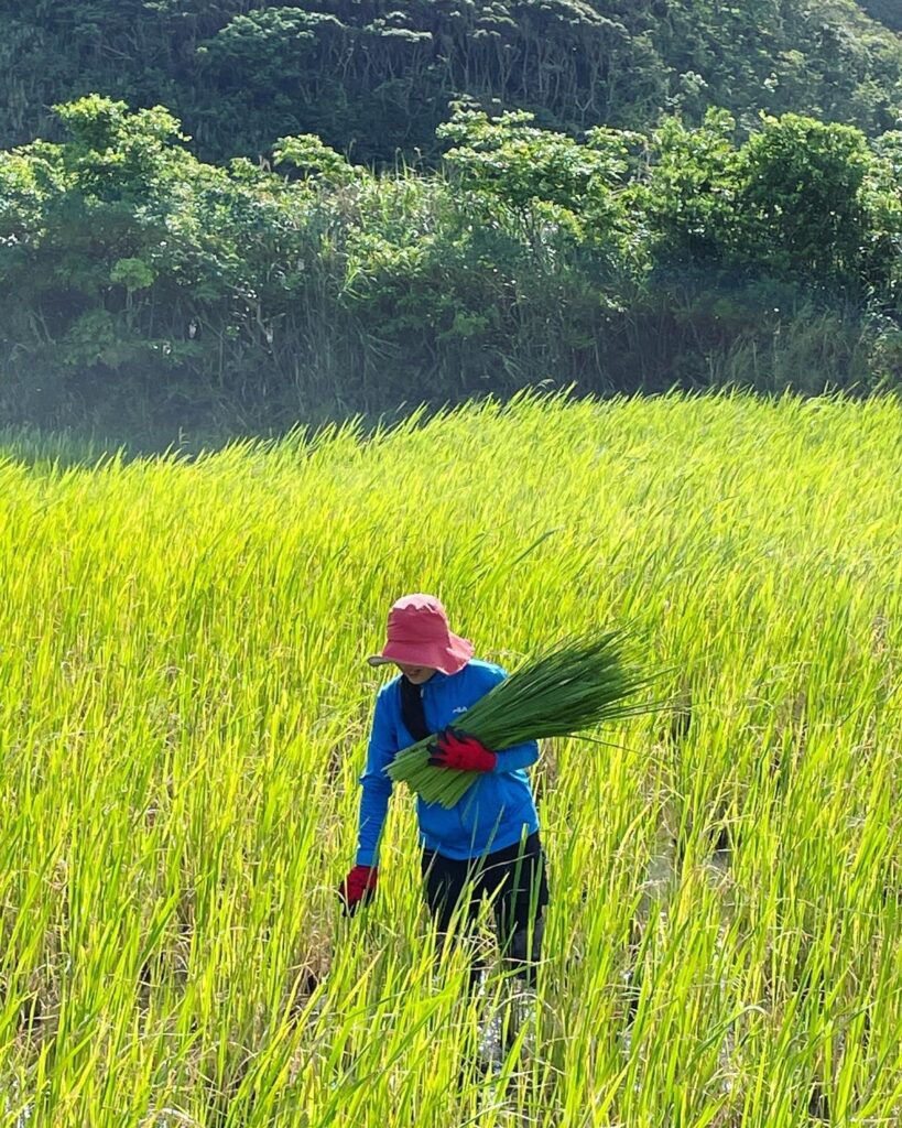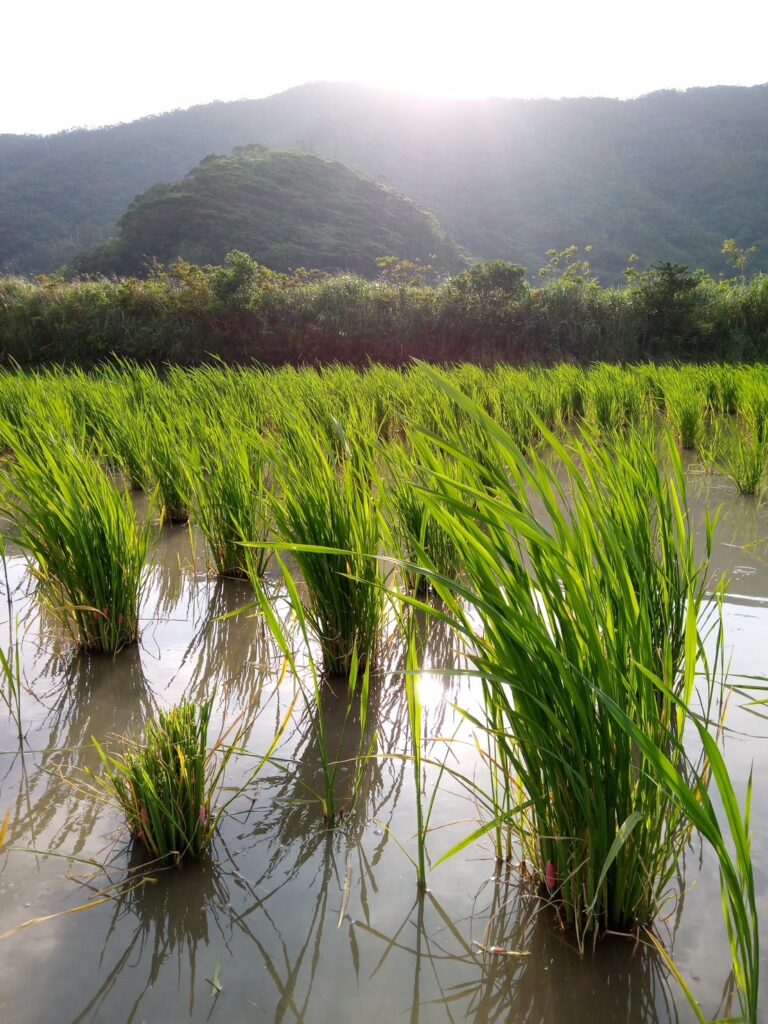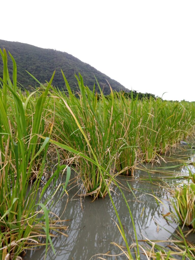奄美大島では珍しく水田が広がる、青空の下の真菰畑。とても美しい風景です。
